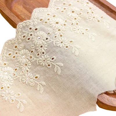 Cotton fabric with lace trim is suitable for making dresses, blouses, or skirts. It is also perfect for creating home decorations, such as curtains, tablecloths, cushions, or other textile accessories. Due to its softness and decorative appearance, it is very popular among sewing enthusiasts and creative crafters.