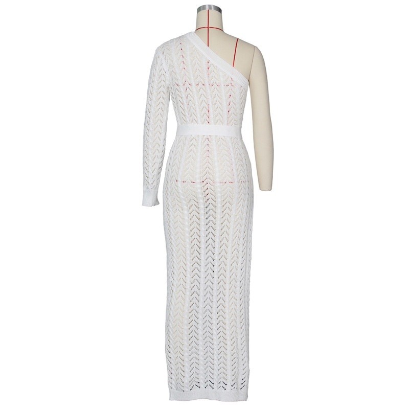 Beautiful long crocheted dress with one shoulder.