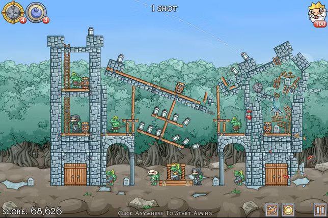 • Throw stones, bombs, and other items at monumental towers and castles to bring them to their knees!