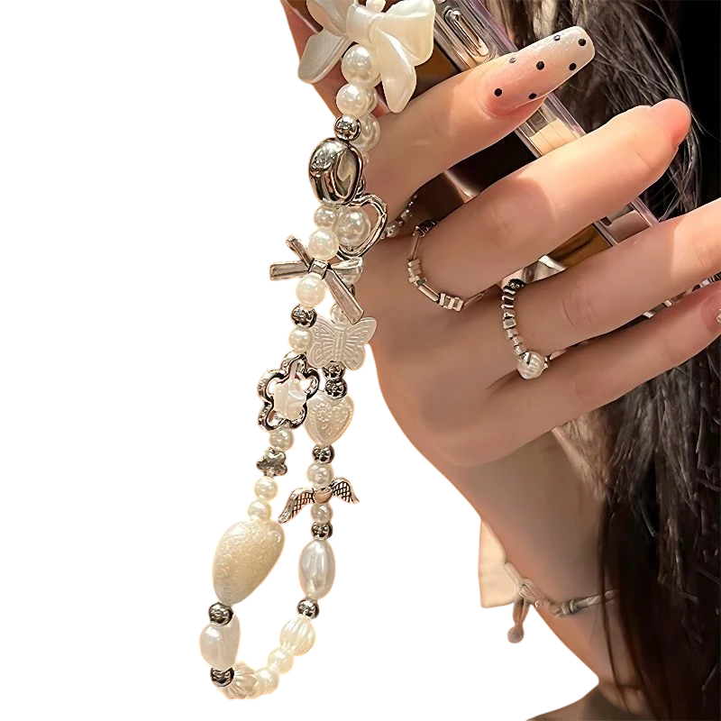 Cute Beaded Phone Chain White Pendant with Bow Heart Flower and Butterfly Decorative Strap for Mobile Keychain