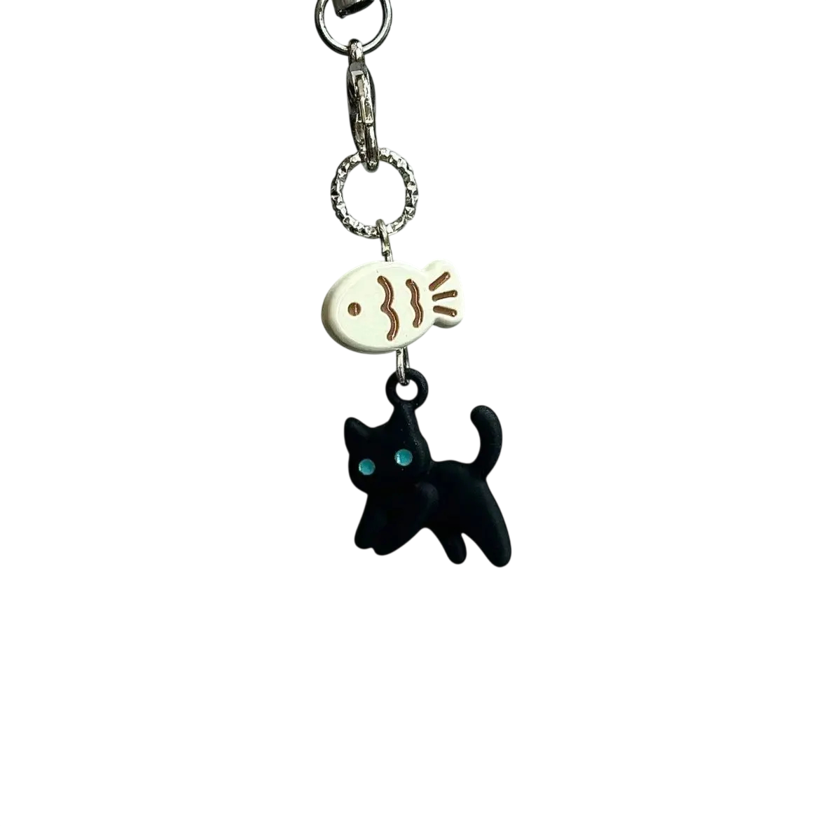 Cute charm featuring a black cat and a white fishbone. A stylish decoration for your mobile, keys, school bag or camera. Full description