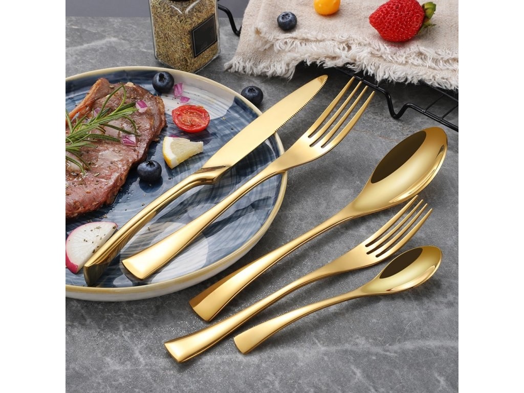 The cutlery features a modern elongated design with a wide handle.