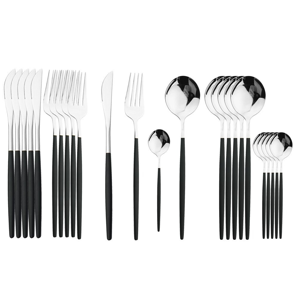 If you want to give your dining a modern touch, acquire this cutlery set. The cutlery is made of high-quality stainless steel and fits perfectly in the hand. The set includes teaspoons, spoons, knives, and forks, with 6 pieces of each.