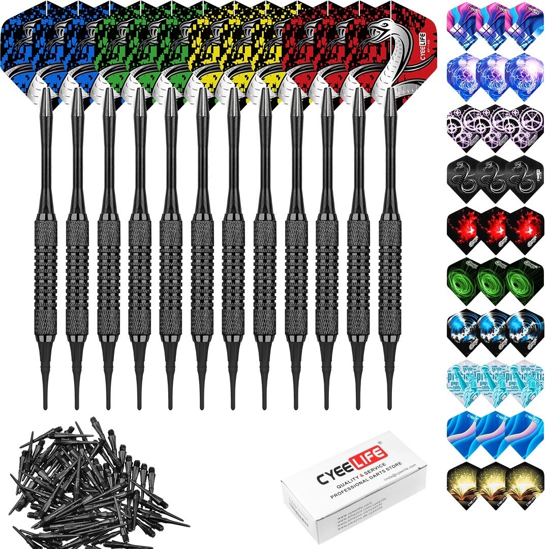 12 darts, 100 plastic tips and 30 spare flights. They are made from durable material. Comfortable to hold. Full description