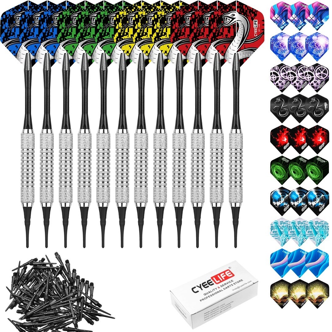 Comfortably held. The set includes 12 darts, 100 plastic tips and 30 spare flights. They are made from durable material. Full description