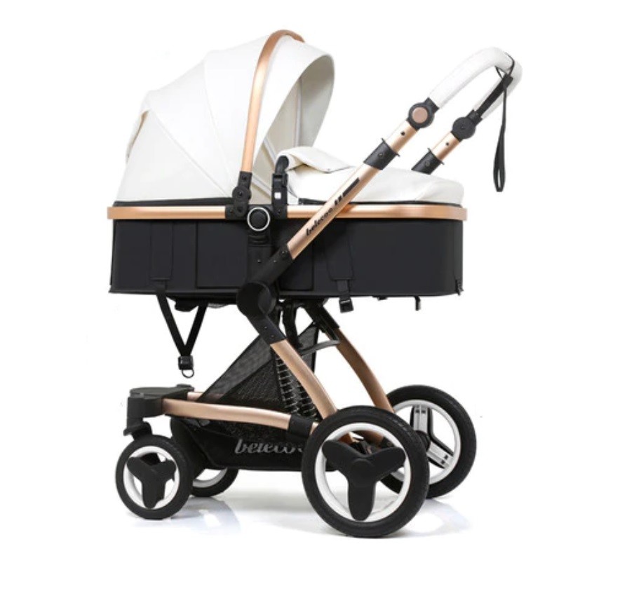 The pram includes a mattress, mosquito net, and footmuff.