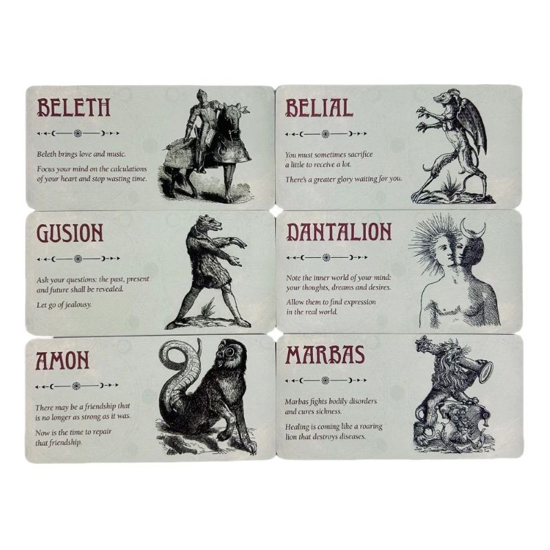 This tarot deck is focused on divination work and working with symbolism inspired by demonic motifs. Each card features an illustration accompanied by text that expands its meaning and aids in interpretation. The visual style draws from detailed drawings and symbolic figures that give the cards a distinctive appearance.