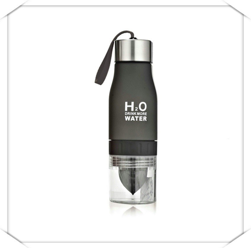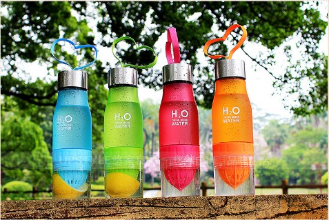 Original plastic detox water bottle, which is equipped with a juicer for lemon or lime at the bottom end.
