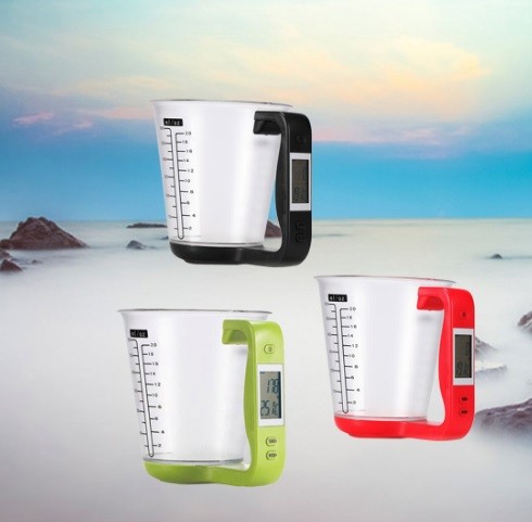 Digital scale with measuring cup. You can either weigh food or measure quantities using the measuring cup.