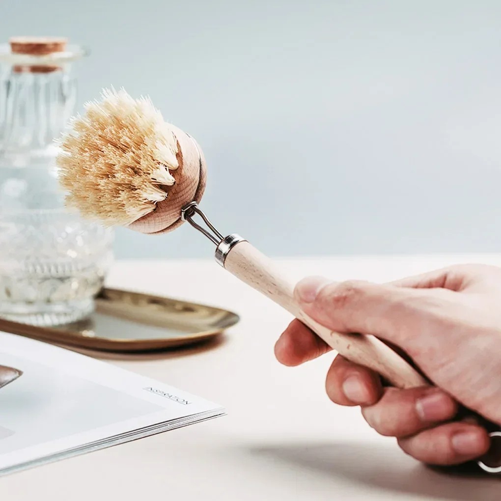 Home page Home page Home & Household Supplies Cleaning Tools Dishwashing Accessories Dish Brush 23 x 4 x 4 cm Wooden Handle Natural Bristles Rotating Head Metal Hook Kitchen Cleaning Brush