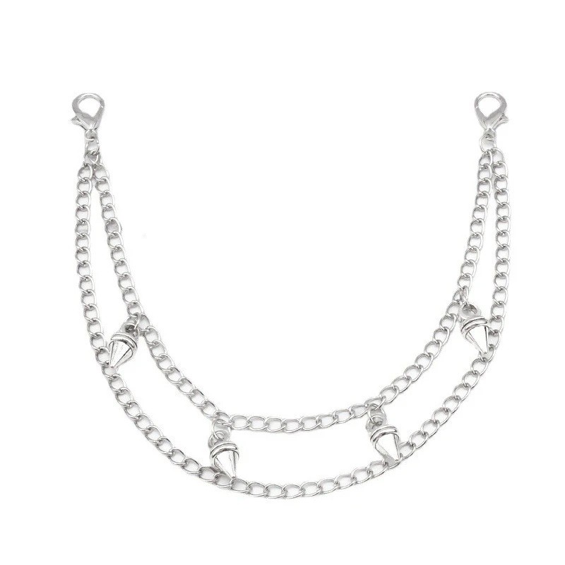 The chain features a double construction, which is made up of two separate chains attached to clasps at both ends. Conical charms are distributed along the lower chain, creating a prominent element that distinguishes this model from other types of decorative handbag chains.