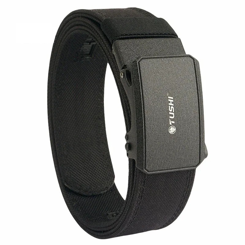 Durable tactical belt with a double layer and metal automatic buckle for secure attachment of weapons, accessories, and tools. Full description