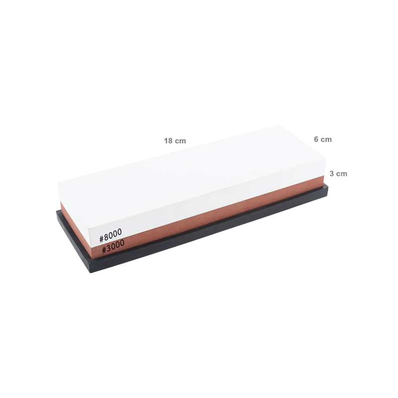 The double-sided sharpener with grits of 3000 and 8000 is the ideal choice for anyone seeking precise sharpening of knives, scissors and woodworking tools. This professional sharpening stone is made from high-quality white corundum, ensuring smooth, even and extremely sharp results. It is used with water, which reduces friction and improves sharpening efficiency. The non-slip silicone base guarantees safe and stable use throughout the process. Suitable for both home and professional use in kitchens or workshops.