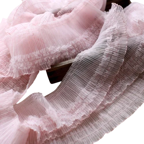 This ruffled fabric is ideal for embellishing dresses, skirts, blouses, or children's clothing. It is also frequently used in creating wedding decorations, festive textiles, or various handmade projects. Due to its decorative appearance, it is popular among sewing enthusiasts, designers, and creative makers.
