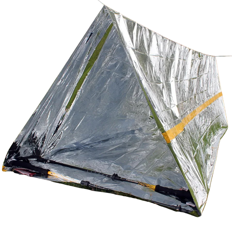 This emergency shelter made of mylar film is the ideal solution for survival in the outdoors, hiking, camping, or as part of a rescue kit in your car. It offers ample space for two adults and its waterproof material provides effective protection against rain, wind, and cold. Thanks to its compact size when folded, it is lightweight and easily portable. The mylar film retains heat and reflects body temperature back, helping to maintain bodily comfort even in adverse weather. The shelter's construction is simple, quick, and allows for rapid assembly without tools.