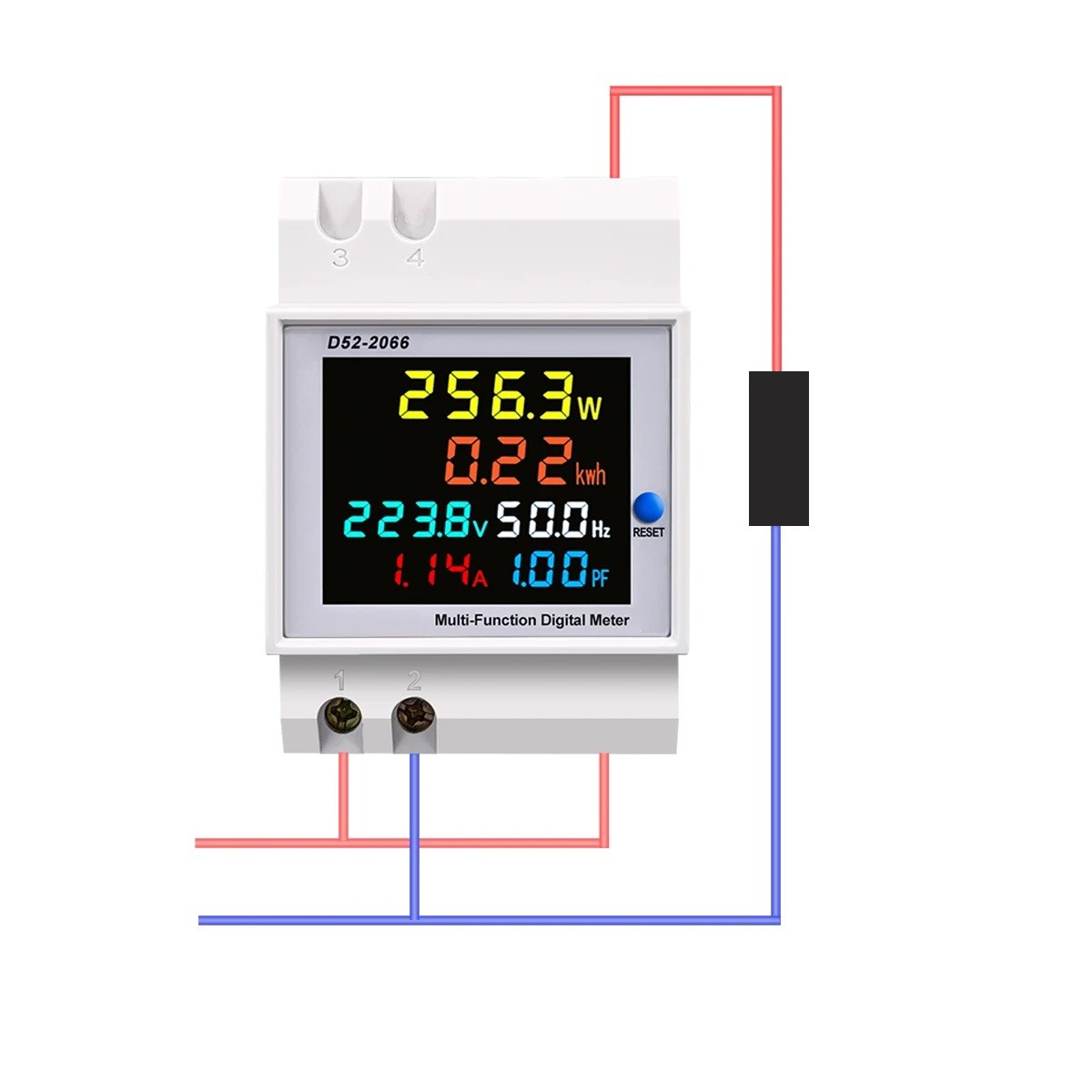 • Colour display with separate colours for voltage, current, power, energy, and PF.