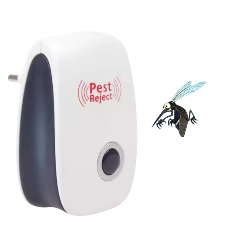 Silent electronic mosquito repeller with ultrasonic frequencies of 22–65 kHz. Coverage of 80–120 m², EU plug, red LED, ideal for homes and businesses. Full description