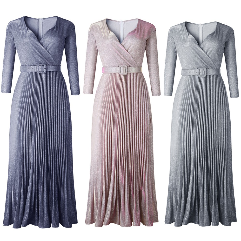 Long pleated skirt and deep neckline.