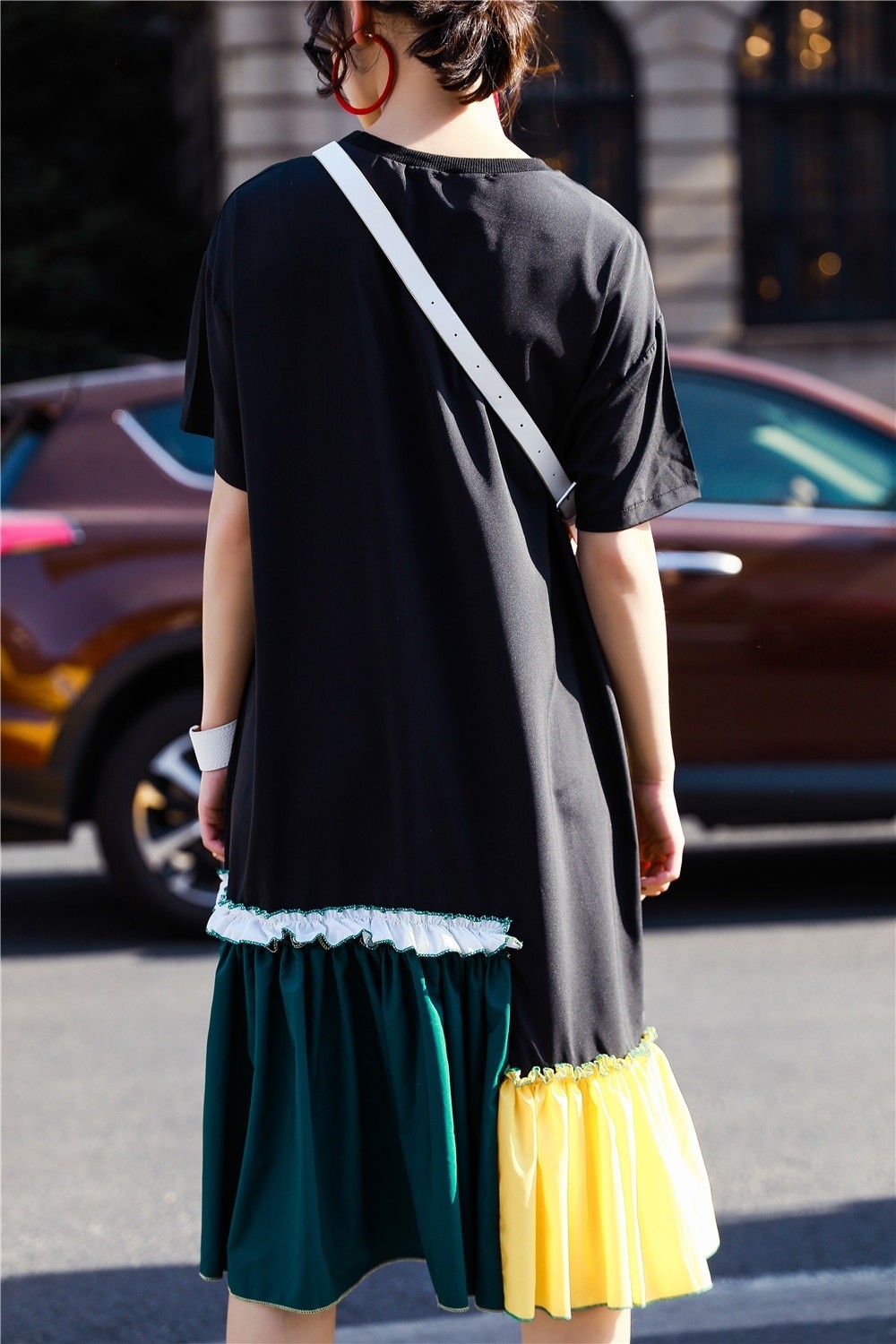 The dress features short sleeves and a round neckline.