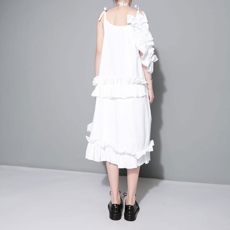 Women's ruffled strappy dress with one off-the-shoulder sleeve.