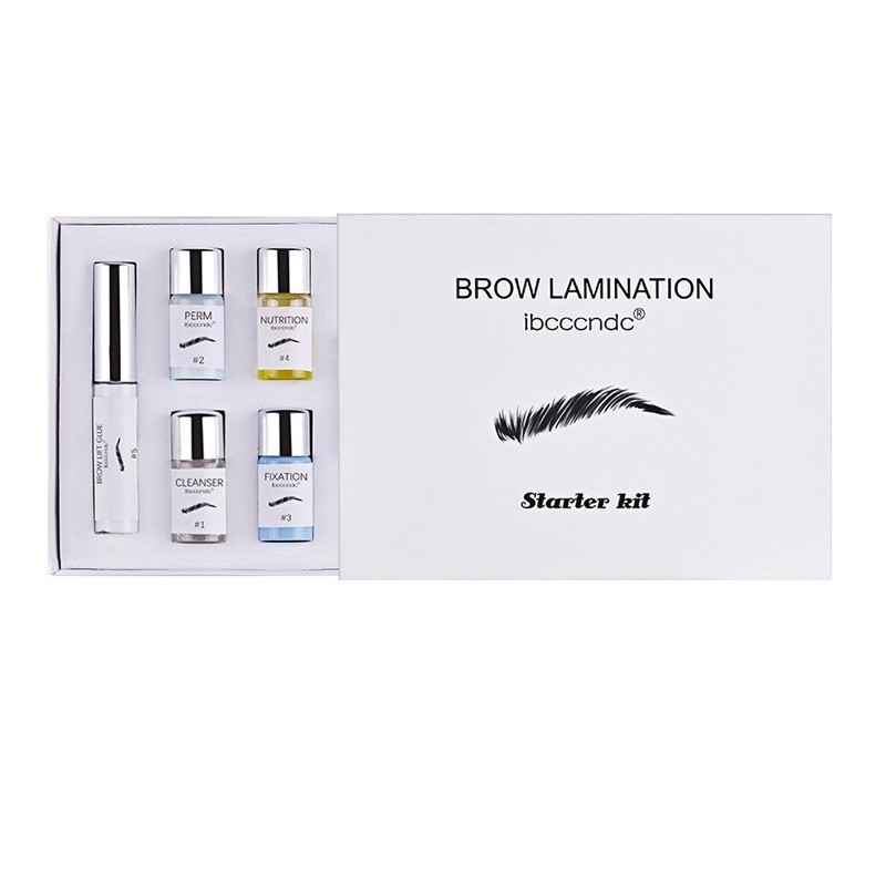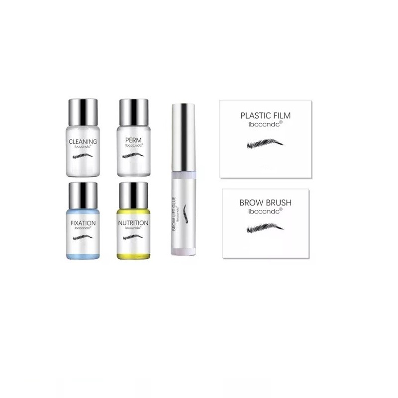 Contents of the package: 1x adhesive film, 1x eyebrow lifting brush, 1x 5 ml cleansing agent, 1x 5 ml skin lotion for perm, 1x 5 ml fixing milk, 1x 5 ml nourishing milk, 1x 7 ml adhesive for eyebrow lamination to secure the hairs