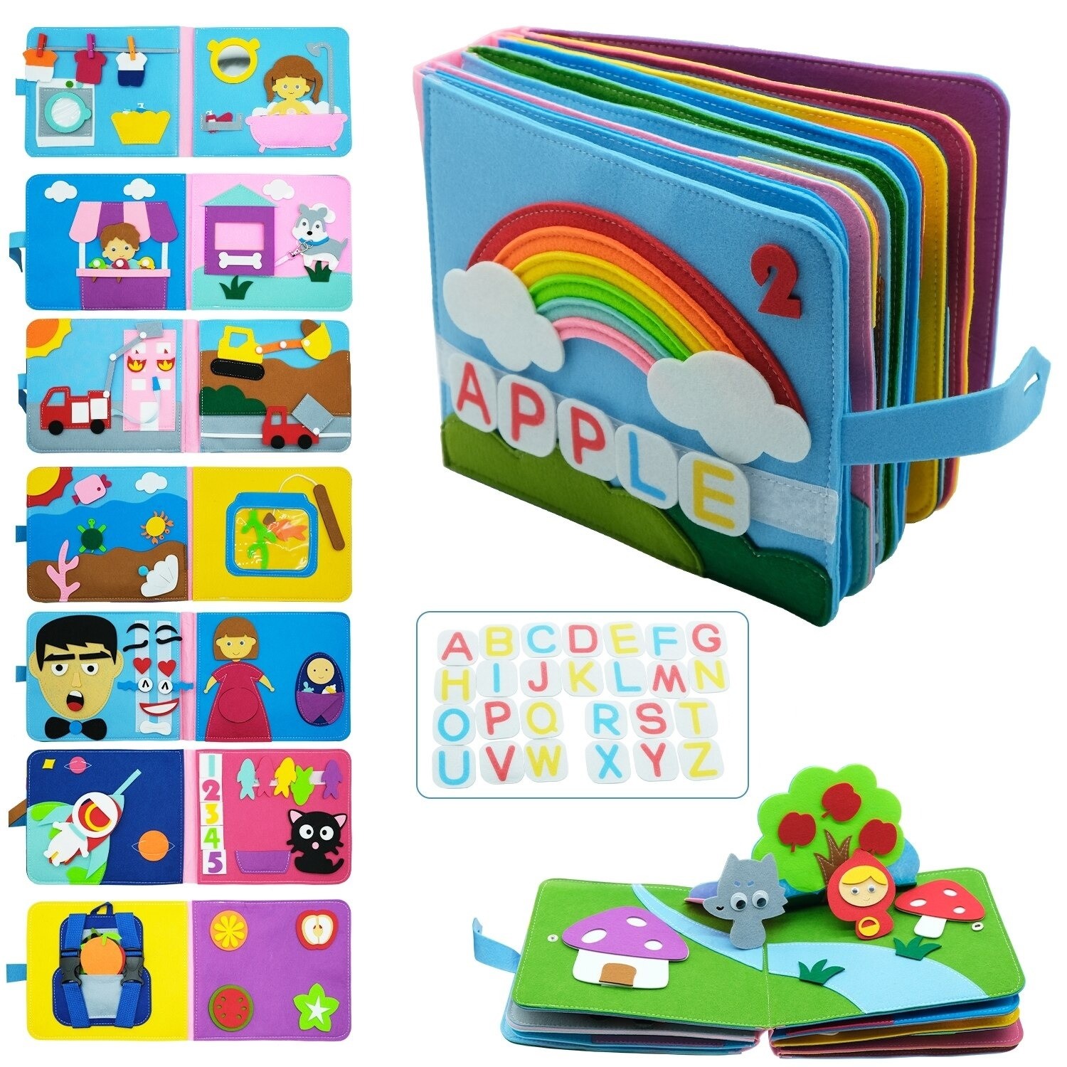 A textile book that will entertain your little treasures. The book contains many activities that help children develop fine motor skills, logical thinking, and imagination. The rich variety of colours provides the child with different visual experiences while teaching them to recognise various colours, shapes, sizes, etc. Many items, including characters, are attached with Velcro, allowing the child to place objects in different locations and develop their creativity and logical thinking. It can stimulate your child's language skills, reading ability, sensory skills, communication skills, and rich imagination.