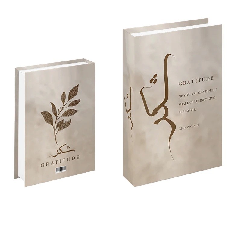 This designer fake book in a soft beige finish features elegant calligraphy of „Shukr“ on the front and the word „Gratitude“ accompanied by a quote. The minimalist background with a subtle texture and natural leaf motif creates a calm and harmonious atmosphere. Although it appears to be a real publication, it is a non-opening decorative prop designed solely as a stylish home accessory. The warm beige tones accentuate the timeless and elegant character of the entire decoration.