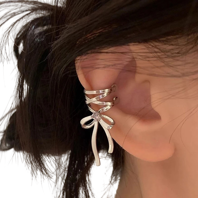 Elegant silver ear clip in bow shape, ideal for Y2K style. Trendy metal earrings for girls and women for any party. Full description