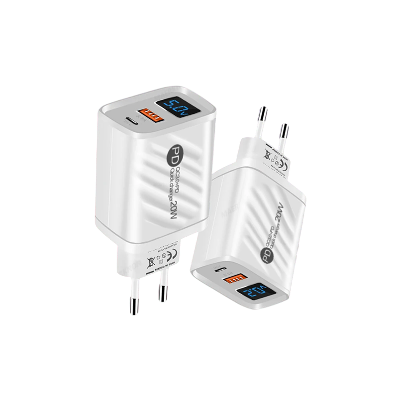 Powerful 20W charger with USB C and USB A ports, LED display and PD support. Quick charging, EU plug, two colour variants. Full description