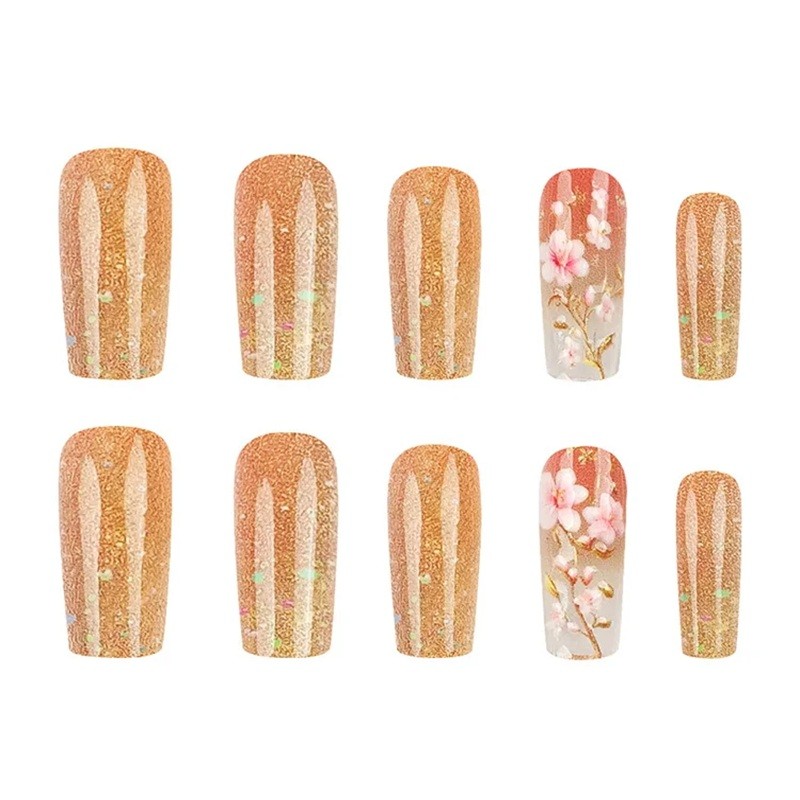 This set of artificial nails combines a popular floral motif with delicate glitter, creating a decorative yet tasteful appearance. The square shape gives the nails a polished look with clearly defined lines, suitable for everyday wear as well as special occasions. The set includes 24 pieces of artificial nails, allowing for a uniform manicure on both hands without the need for complicated adjustments. The floral pattern is designed to be understated, adding softness and a feminine touch to the manicure. The overall style remains one of the long-standing favourites in home manicures.