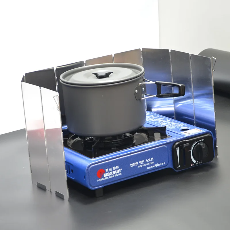 Windy weather will no longer complicate your outdoor cooking. This folding wind shield made of aluminium alloy reliably protects the flame of the gas burner from the wind and ensures stable heating. It consists of 9 connected panels that can be adjusted into an arc or flat as needed. Thanks to its compact size and lightweight, it is ideal for travel, camping, picnics, or the outdoors. The shield also includes practical hooks for hanging, allowing for easy attachment or storage.