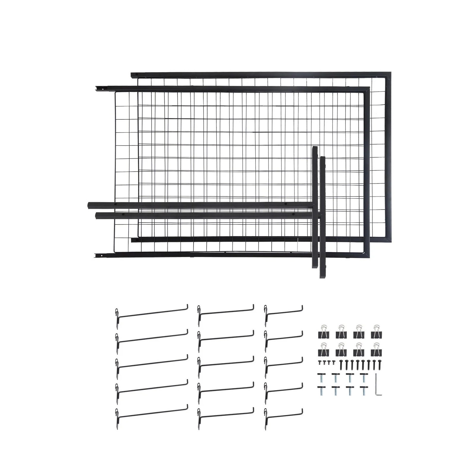 The panels are made from a steel construction and feature a black finish. The grid structure allows for the hanging of hooks, clips, or other accessories for an organised arrangement of displayed items.
