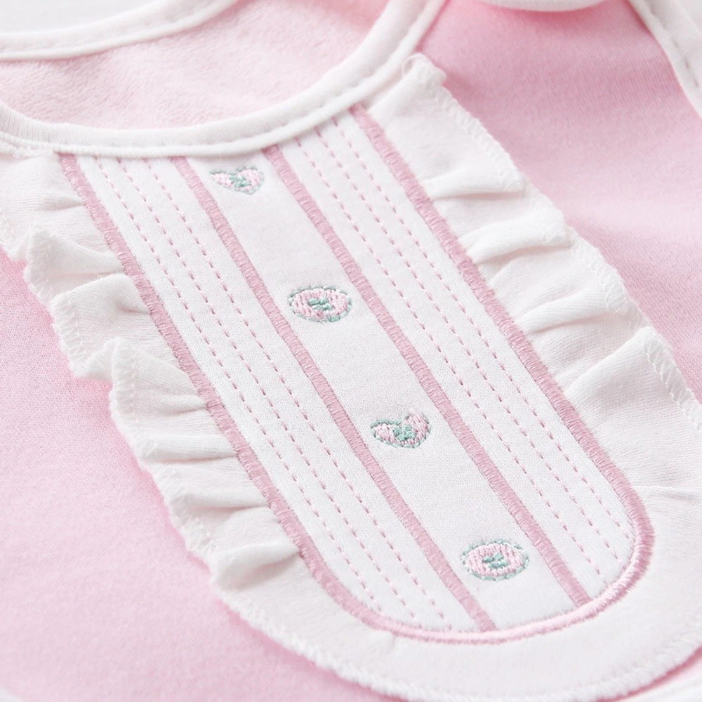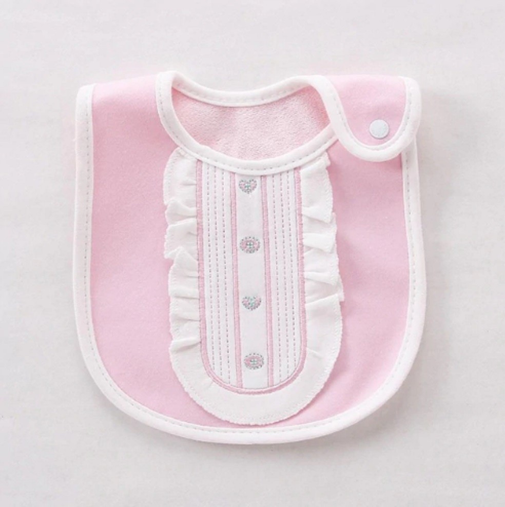 The bib is designed for girls aged 0-3 years and is waterproof.