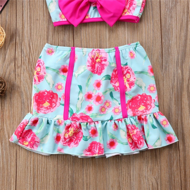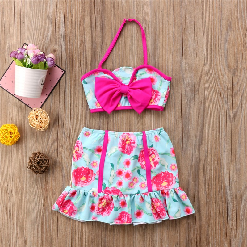 Beautiful girls' bikini with flowers, adorned with a bow on the top piece.