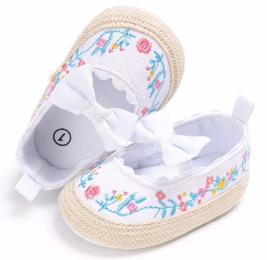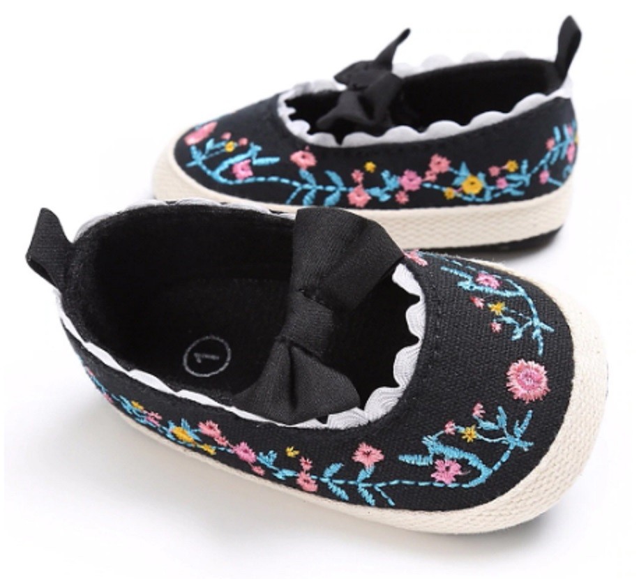 Girls' canvas booties with an elastic band over the instep will hold securely on every little girl's foot.
