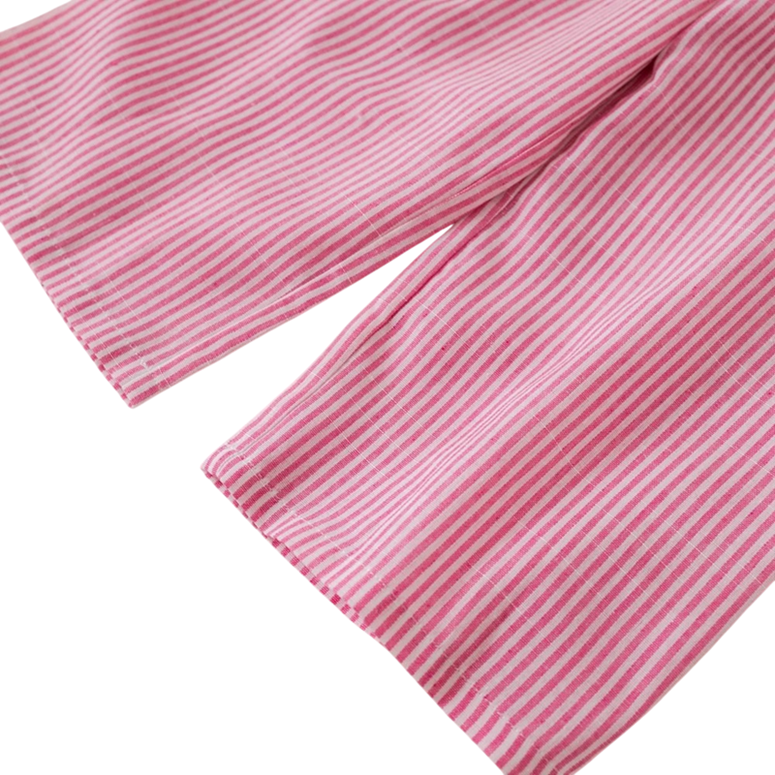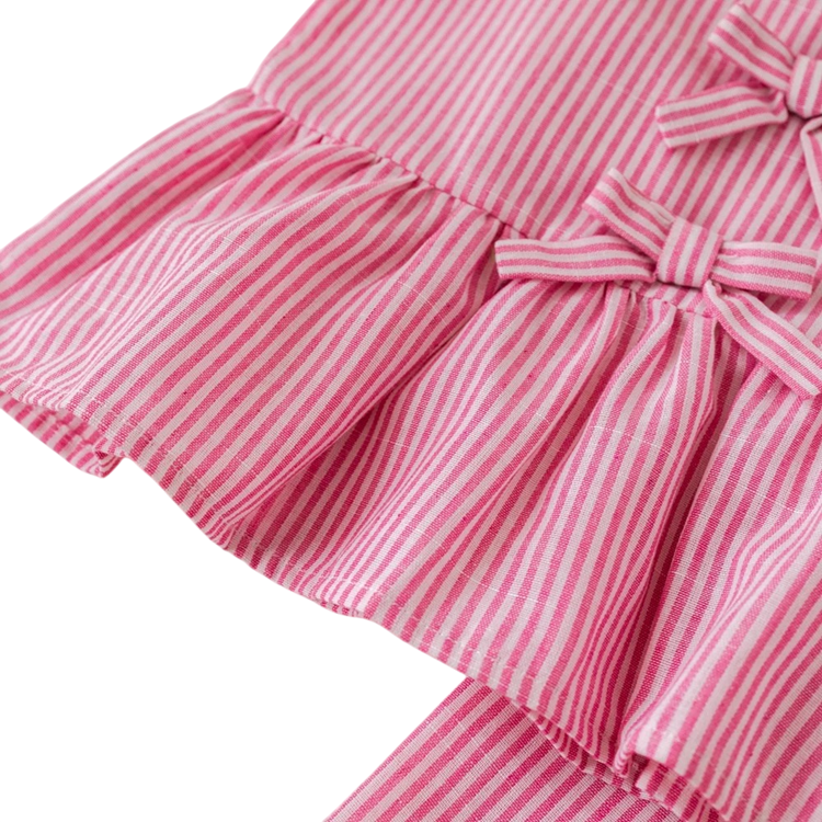 The set is an ideal choice for regular daily activities during warm days. The material is pleasant to the touch, and the cut allows freedom of movement throughout the day. The pink stripes appear soft and elegant, making the clothing suitable not only for home but also for walks or visits. Parents will appreciate the practical design and easy maintenance without complicated requirements. Girls will love the comfort and playful design with bows.