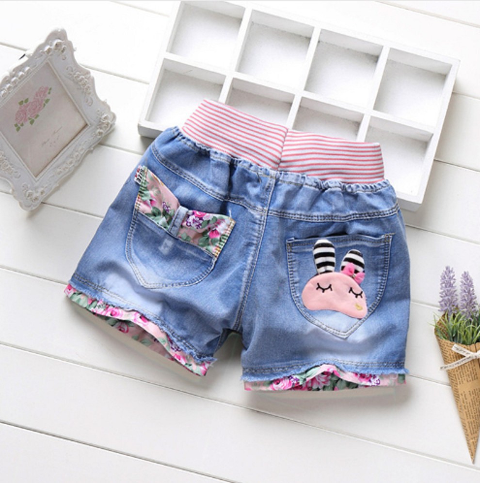 Beautiful denim shorts with various prints on the back pockets.