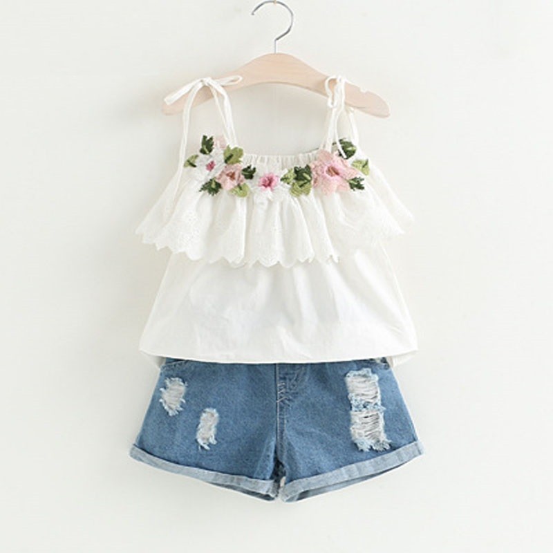 Girls' Set - Top with Flowers and Shorts - White