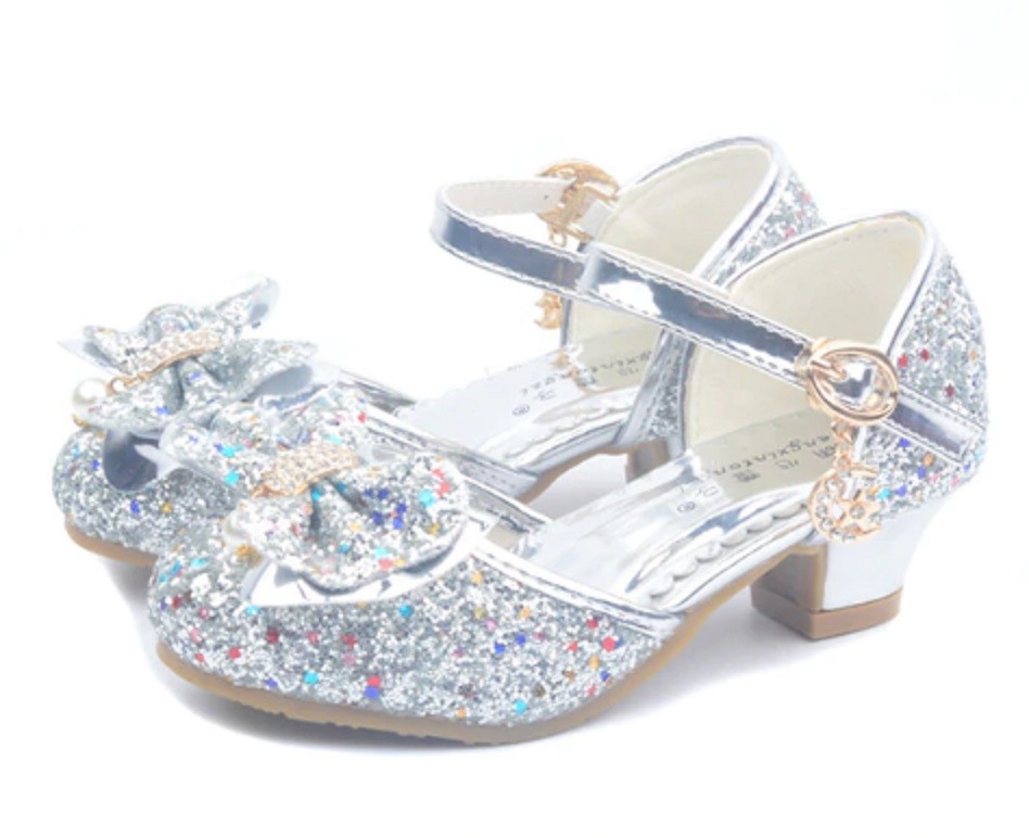 The shoes have a modest heel and fasten with a strap around the ankle.
