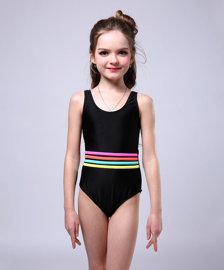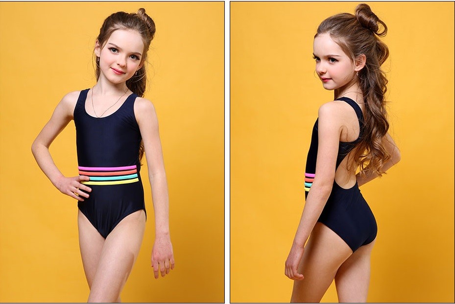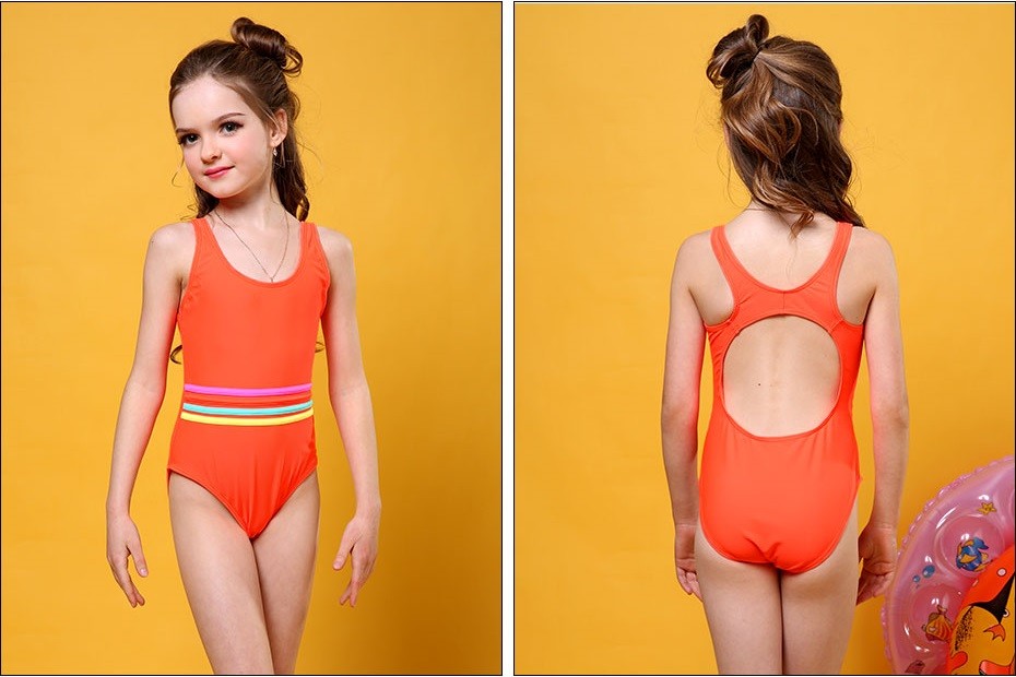 Beautiful girls' swimsuit with a hole at the back and decorative stripes at the waist.