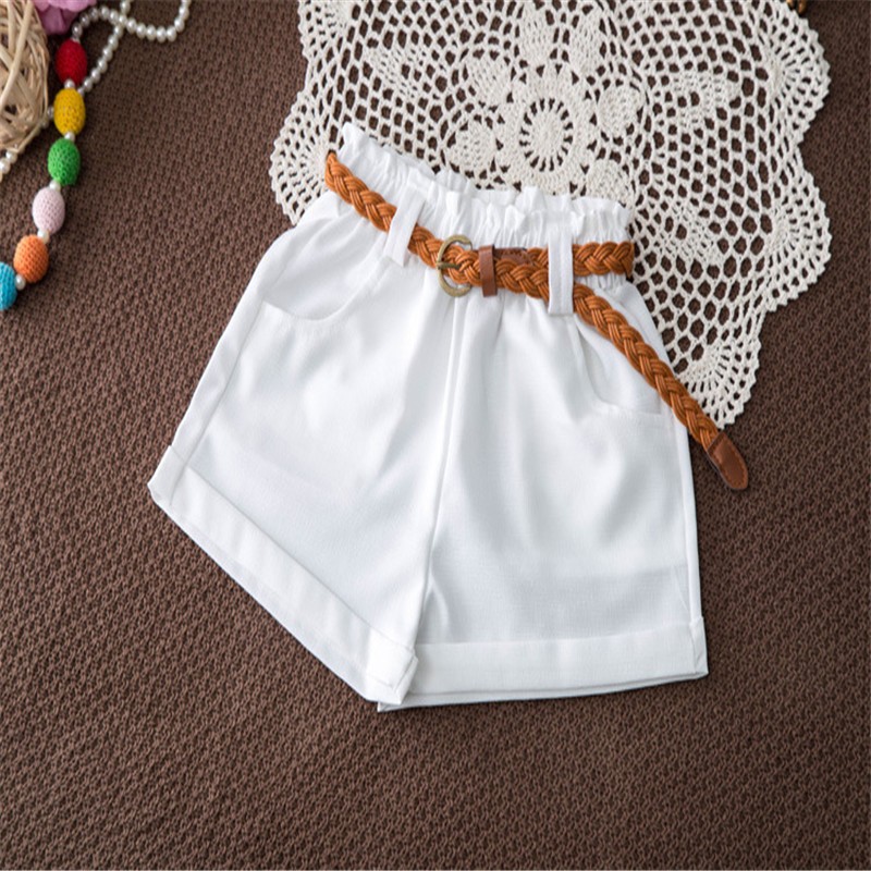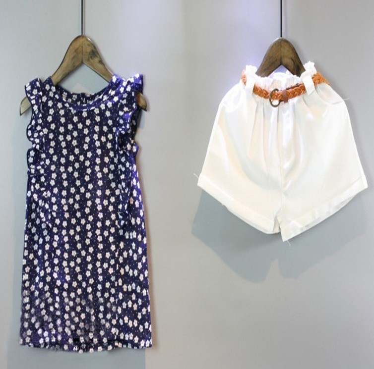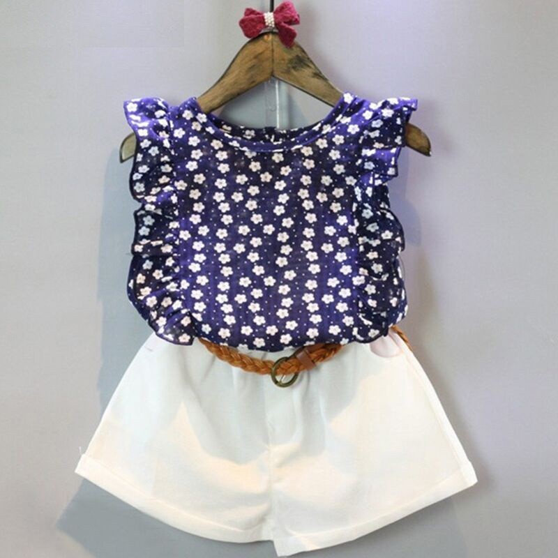 The set consists of a blue tank top with flowers and white shorts with a belt.