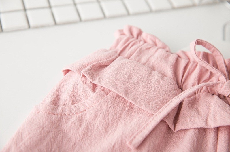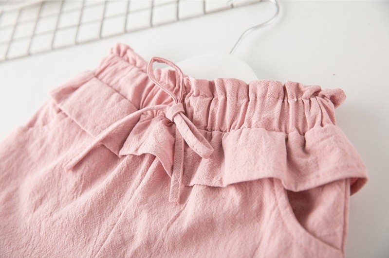 The set consists of a white tank top with flowers, and the sleeves are ruffled, along with pink shorts that have drawstrings.