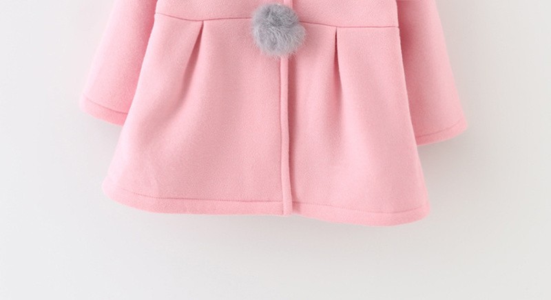 The coat has a hood and is adorned with pom-poms.