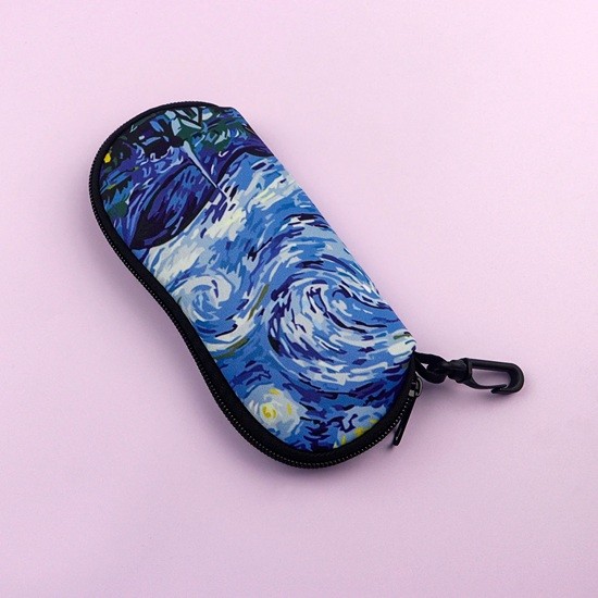 Stylish case with an artistic sea and wave design, featuring a zip and a clip for hanging. Protects glasses from damage. Full description