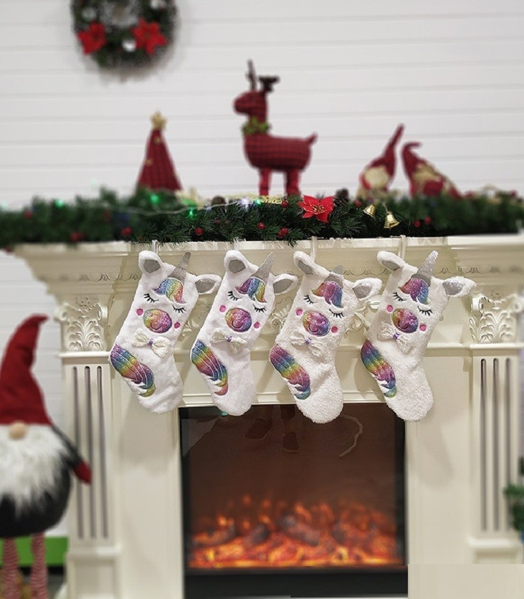Christmas hanging stocking for gifts featuring a unicorn design.