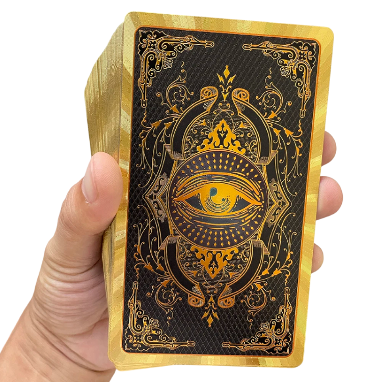Golden Foil Tarot with 78 cards and a bilingual guide. Practical format and clear markings in English and Spanish. Full description