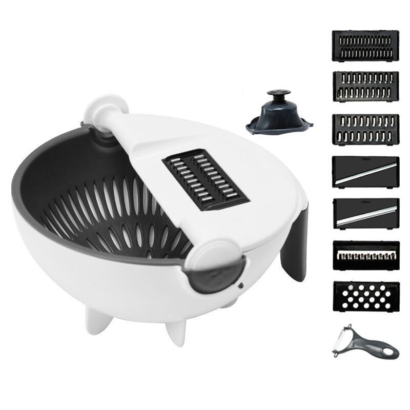 Contents of the package: 1x grater with container, 7x interchangeable blade, 1x protective cap, 1x peeler