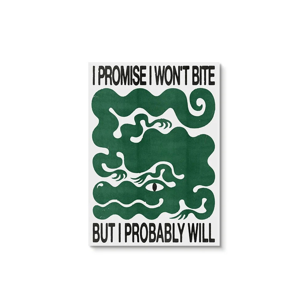 This modern graphic poster with the humorous text “I Promise I Won’t Bite – But I Probably Will” and a motif of tentacles will charm you with its playful, ironic, and slightly mysterious depiction. The contrasting combination of green and black on a white background creates a striking impression that captures attention at first glance. The poster is suitable for those who appreciate bold and unconventional art, which serves not only as decoration but also as a conversation starter in the interior. Ideal for modern living rooms, student rooms, creative studios, or as a unique gift. The poster has a size of 40x60 cm and is printed on high-quality canvas without a frame.