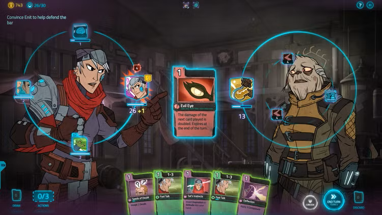 Each character has unique negotiation and combat decks to draft from. Acquire powerful item cards from fallen enemies or as rewards.