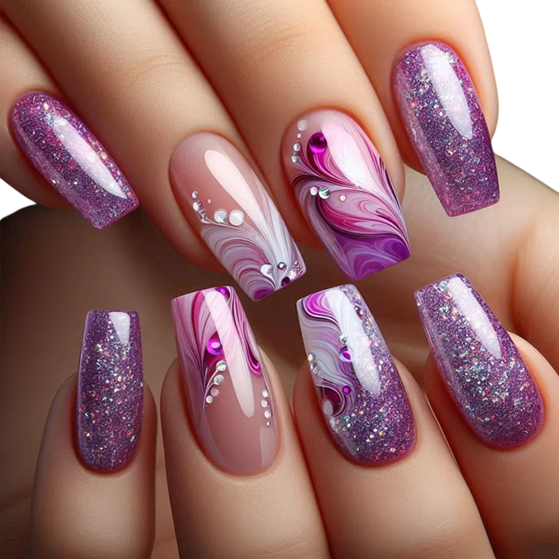 The artificial nails from this collection combine a creative appearance with practical use. The hand-painted motifs add a personal touch to the manicure, distinguishing it from standard solid colour styles. The square shape ensures a stable and even impression, which appears natural and elegant. With a larger number of pieces in the package, it is possible to customise the manicure as needed. Original decorative design complements various outfits and highlights individual style. This set represents a simple way to achieve a striking nail look in a home environment.